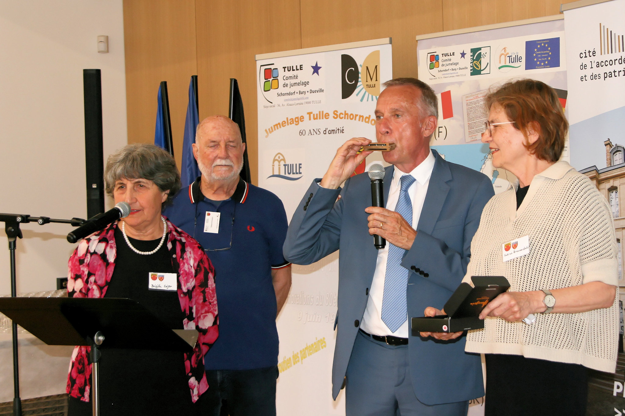 Im zum Garten geöffneten Auditorium des Museums wurde zum Empfang durch die Stadt Tulle eingeladen. In seiner Rede sprach Bürgermeister Bernard Combes über die Ressentiments der französischen Bevölkerung, ja sogar Hass gegenüber den Deutschen, bedingt durch die Gräueltaten der Waffen-SS, die durch dauerhafte und aktive Freundschaften der Nationen und der Partnerstädte überwunden werden konnte für ein starkes und einiges Europa. Es folgte die Zweite Bürgermeisterin für Kultur Christiane Magry-Jospin. Außerdem sprachen der Präsident Michel Breuilh des französischen Gemeindeverbands Tulle Agglo, und die Schülerin Carmen Tenaud, der ABIBIVereinigung der deutsch-französischen Abibac-Klasse des Lycée Edmond Perrier. Für die Partnerschaftskomitees Tulle und Schorndorf sprachen Gérard Amann und Brigitte Cajar, die Stadträtin Sabine Brennenstuhl in Vertretung für Oberbürgermeister Bernd Hornikel (der seinen Antrittsbesuch in Tulle im September nachholen wird) und zuletzt Jean Combasteil, langjähriger Bürgermeister von Tulle (1977-1995), der seine Freude zum Ausdruck brachte, dass die Städtepartnerschaft seit 1969 intensiv gelebt wird.
