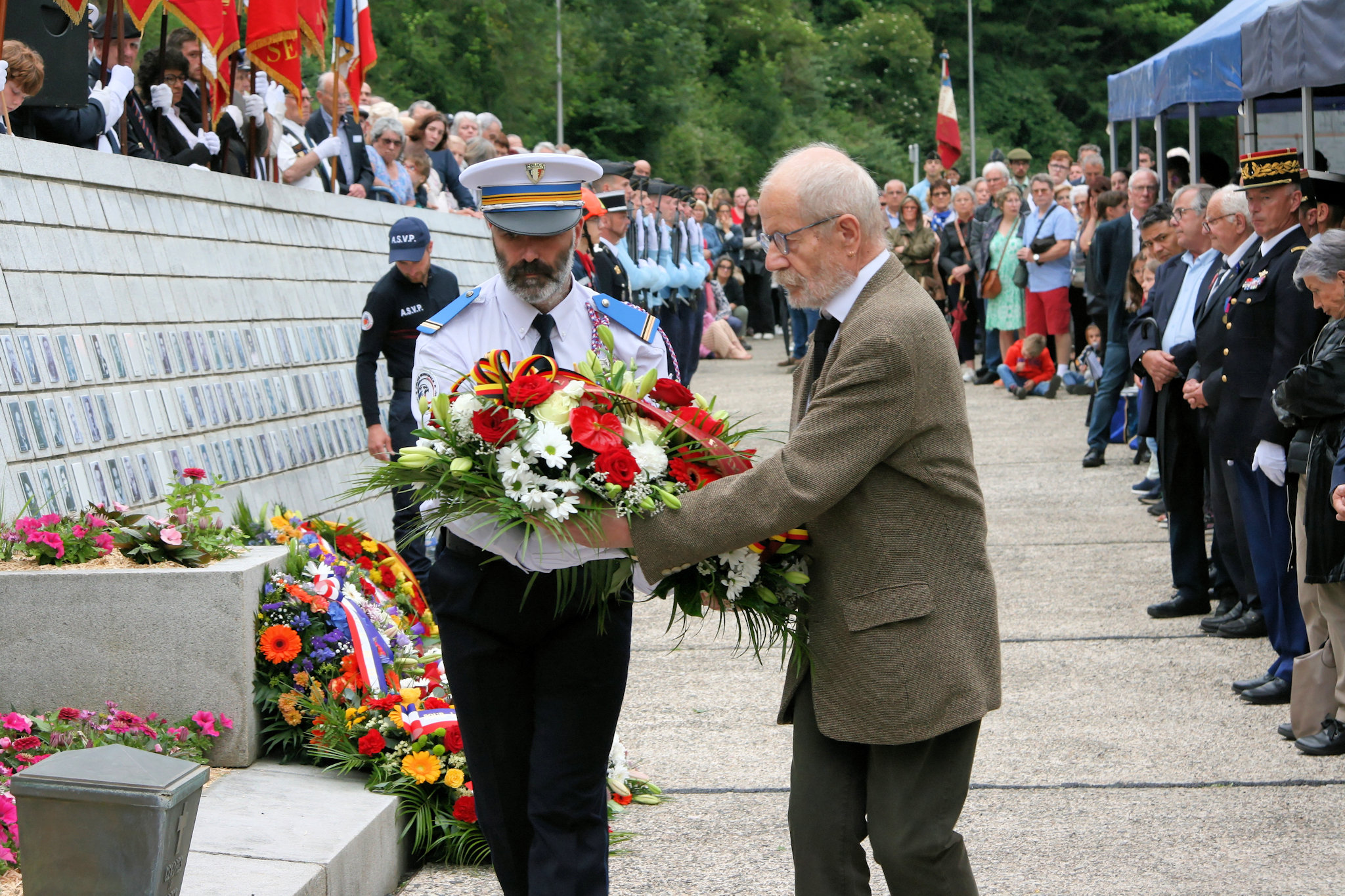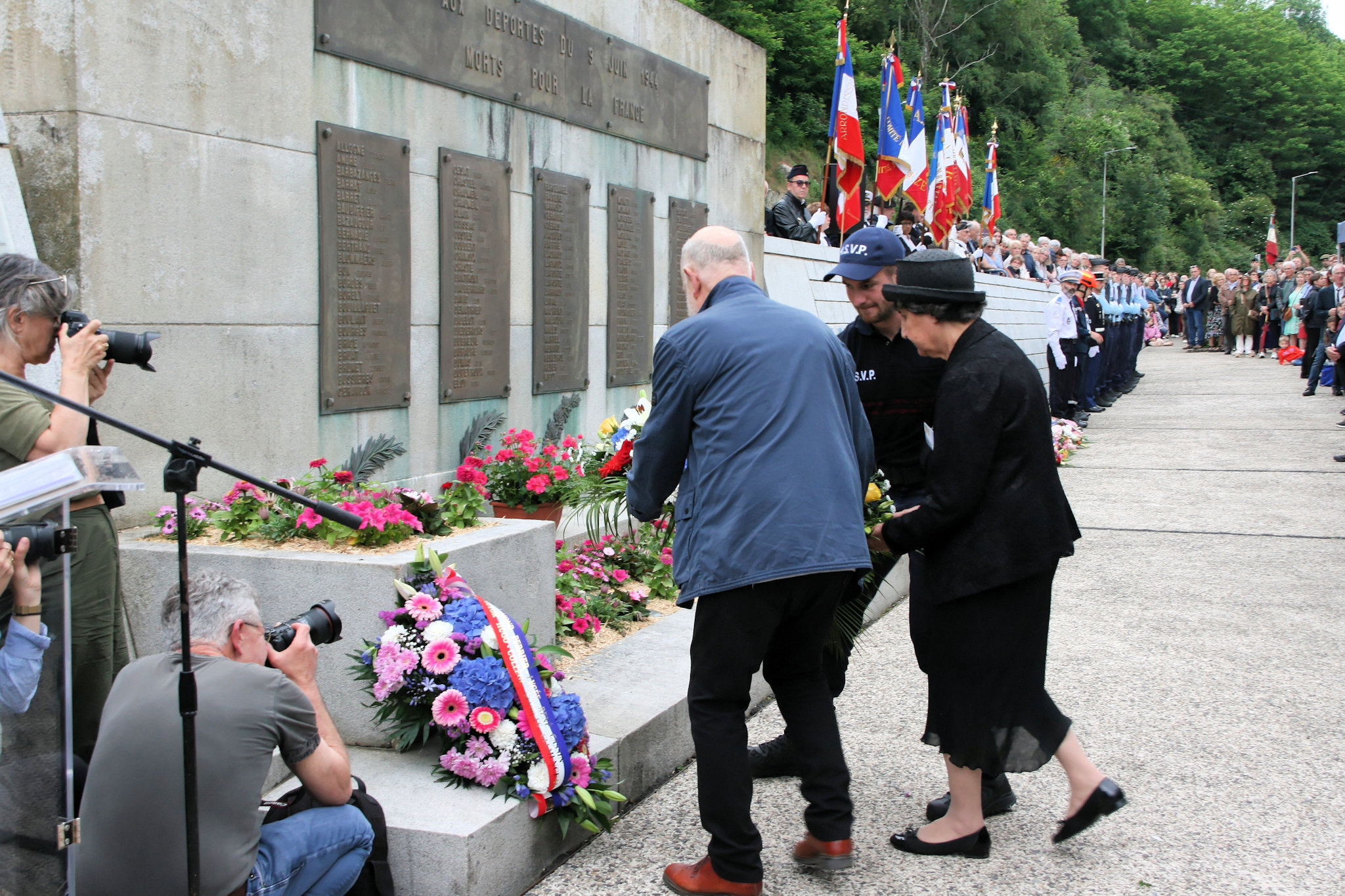 Angekommen an der Gedenkstätte des Massengrabs der Opfer, dem „Champ des Martyrs“ an der Haut-Lieu de Cueille, außerhalb der Stadt, verlasen Schülerinnen und Schüler des örtlichen Gymnasiums die Namen der Ermordeten. Vor kurzem wurden an dem seit 1950 bestehenden Memorial Fotoplaketten angebracht, damit nicht nur die Namen, sondern auch die Gesichter der Männer erinnert werden können. In einer feierlichen Zeremonie legten Vertreter von Institutionen und Verbänden Kränze und Blumen nieder. Auch im Namen der Stadt Schorndorf (von Ulrich Kost) und gemeinsam von den beiden Partnerschaftsvereinen (Brigitte Cajar und Gérard Amann). Gegen 19.30 Uhr endeten die Feierlichkeiten am Sonntag, in kleinen Gruppen ging es wieder hinunter in die Stadt. Jetzt nicht mehr so schweigsam.